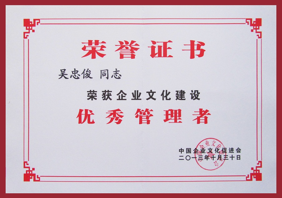 集团公司被授予“企业文化建设百佳单位”荣誉称号;集团公司总经理、党委书记吴忠俊被第四届七次理事会选为中国企业文化促进会副会长,并被评为“企业文化建设优秀管理者”;集团公司企业文化策划处处长?T世革被评为“企业文化建设先进工作者”。我司在企业文化建设方面的成绩得到了充分肯定。