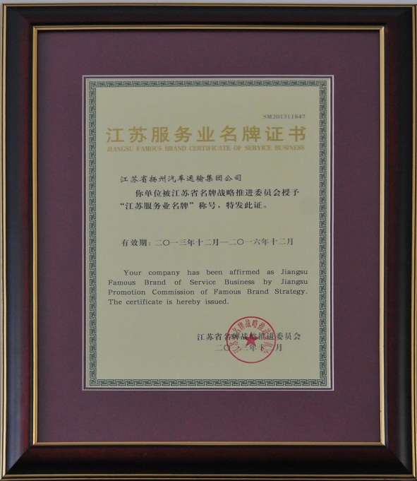 近年来,公司积极贯彻省政府关于加快现代服务业发展的要求,大力实施文化与品牌发展战略,始终坚持把争创企业名牌、推进扬汽品牌发展作为一项系统工程来抓,坚持品牌建设与品牌经营相结合,提升“扬汽品牌”的市场知名度,促进企业健康稳定持续发展。2013年在申报江苏服务业名牌工作过程中,公司依据《江苏省名牌产品管理办法》规定,围绕企业领导、战略、顾客与市场、资源、过程管理、测量分析与改进以及经营结果等七个方面考评内容进行系统申报,自2013年7月开始,历时数月,经严格筛选最终当选。