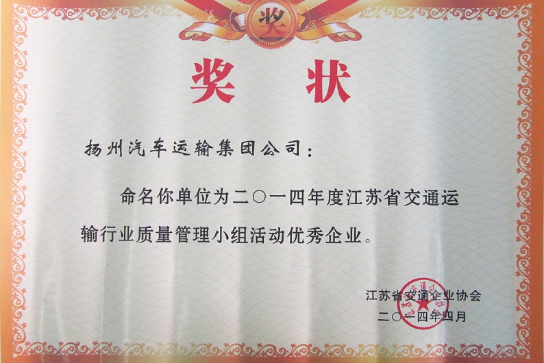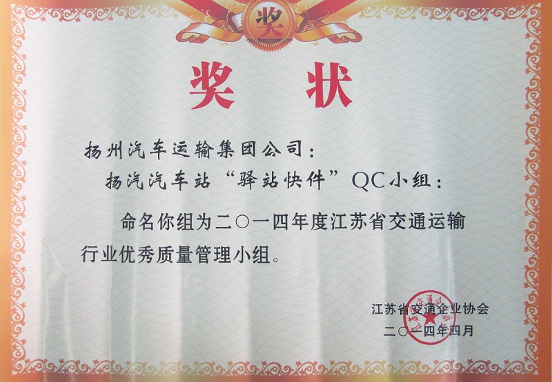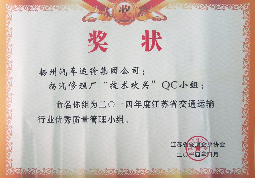 又讯:在此前进行的江苏省交通运输行业优秀QC小组成果评选中,集团公司被表彰为“省交通运输行业质量管理小组活动优秀企业”,扬州汽车站“驿站快件”QC小组(成果《降低到达库收发货的误差率》)与修理厂“技术攻关”QC小组(成果《汽车变速箱小车式托架的研制》)被评为“省交通运输行业优秀质量管理小组”。