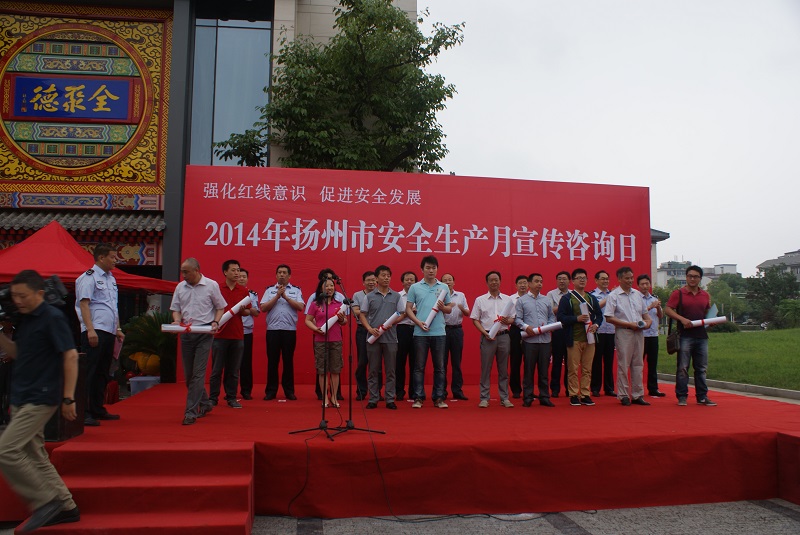 6月16日上午,扬州市安委办会同蜀岗—瘦西湖风景名胜区管委会在虹桥坊举行了以“强化红线意识,促进安全发展”为主题的2014年扬州市“安全生产月”宣传咨询日活动。市安委会、市安监局、蜀冈—瘦西湖风景名胜区管委会、市人保公司负责人出席了活动。市安监局、金沙娱场城app7979、市城建控股集团、市工艺美术集团、金茂化工集团、扬子江集团、建工控股集团等11家单位以及消防、建筑、燃气、气象、质监、部分驻扬单位的职工代表共计400余人参加了活动。