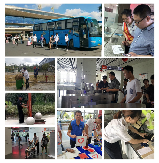 车站各班组分工协作打扫各自责任区域,清扫工作台、参加"志愿服务 美好你我他"第三届江苏志愿服务展示交流活动、清扫路边绿化带、喷洒药水、除杂草灭虫害、整理通道入口、设备设施维护、消防安全检查、身份实名验证、检查危险禁运物品、检查客车安全带、为特殊旅客提供一站式服务、热情引导购票、候车,征询旅客意见、开展问卷调查,以整洁的站区环境、良好的精神风貌和优质的候乘服务当好东道主,文明迎盛会。