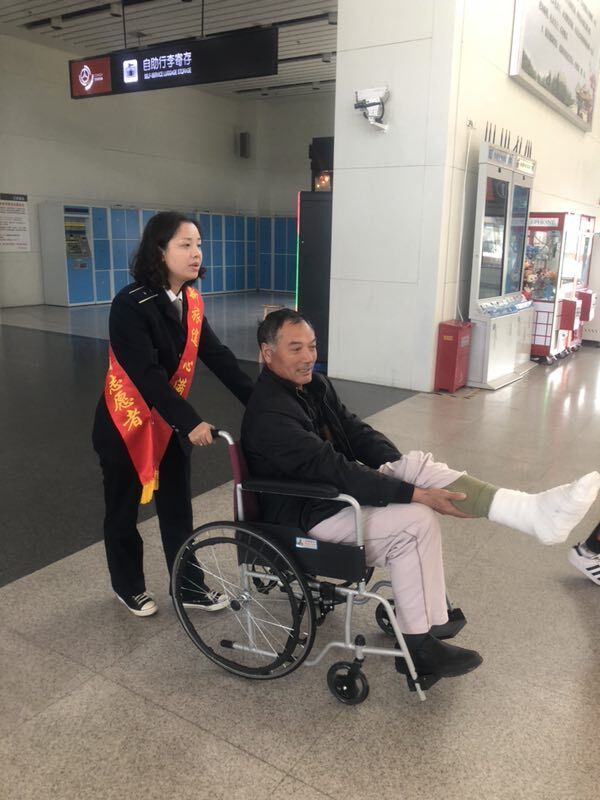 10月15日上午九点半左右,一位特殊的旅客来到扬州汽车站,右脚绑着厚厚的石膏。服务班班长高娟经过票务服务窗口的时候,看见他坐在地上,身边还放着一堆行李。高娟关切地询问道:“师傅,你去哪里的啊?你的脚怎么了?”经交谈,该旅客原是在扬州某工地打工的民工尤师傅,因为工作失误,在工地被钢筋砸伤,工地老板特别安排另一位工友送尤师傅回昆山老家修养。