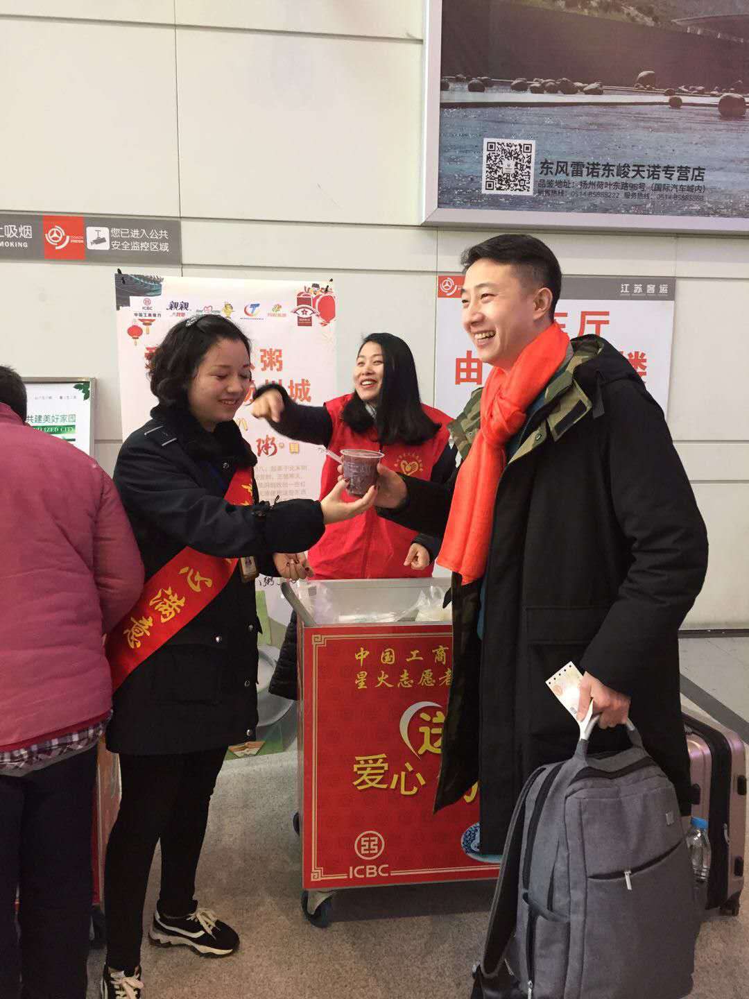 短短的一个半小时,送出了近三百份腊八粥和雪白的馒头。把幸福喝进肚里,把快乐放在心上。山东临沂的王师傅喝着腊八粥动情地说道:“没想到回家的路上能在扬州汽车站感受到节日的快乐,扬州人真的善良”。