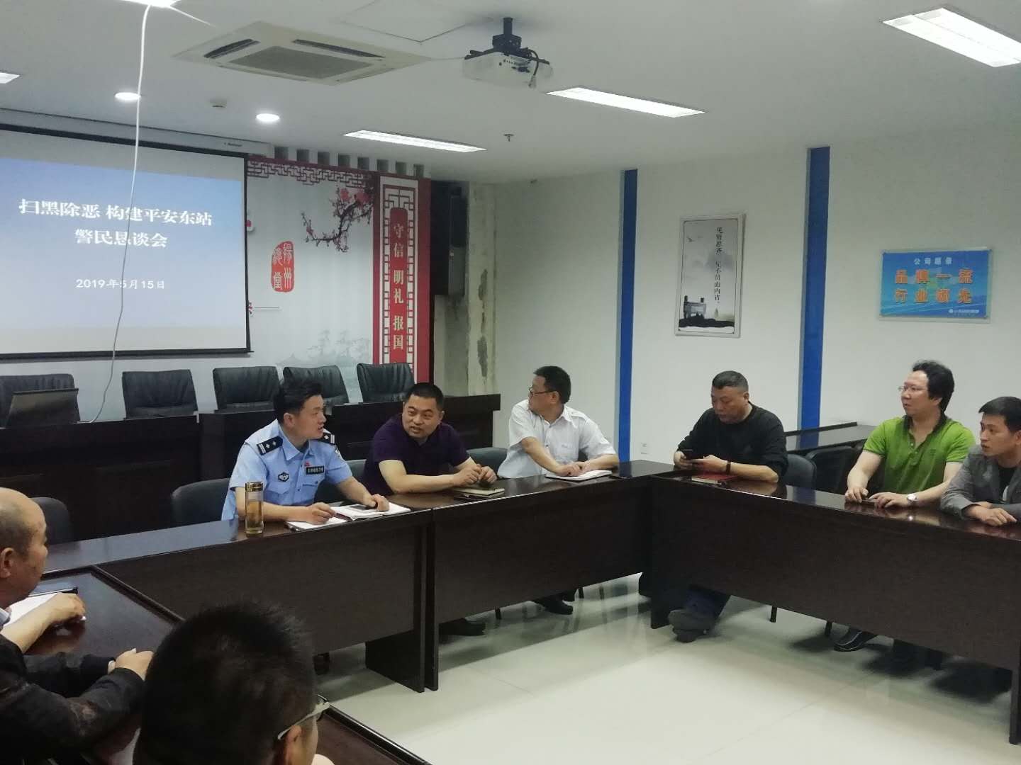 2019年5月15日上午9点30分,东站召开扫黑除恶专题工作动员大会,东站支部书记、管理人员、班组长和超市及宾馆等商户参加了会议,会议由扬州市公安局公交分局东站派出所所长李方民主持。