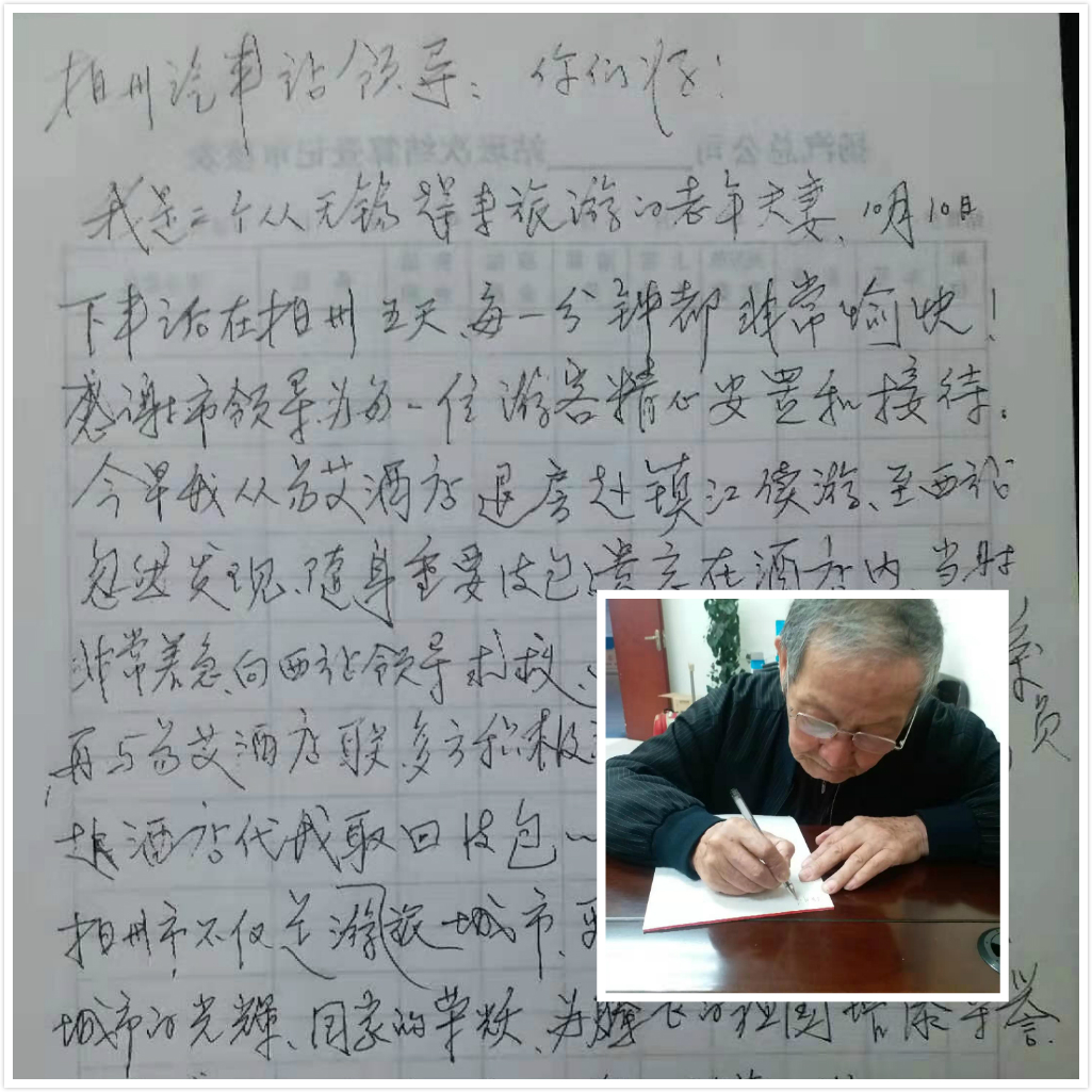 八旬老人写下文字感谢扬州站工作人员
