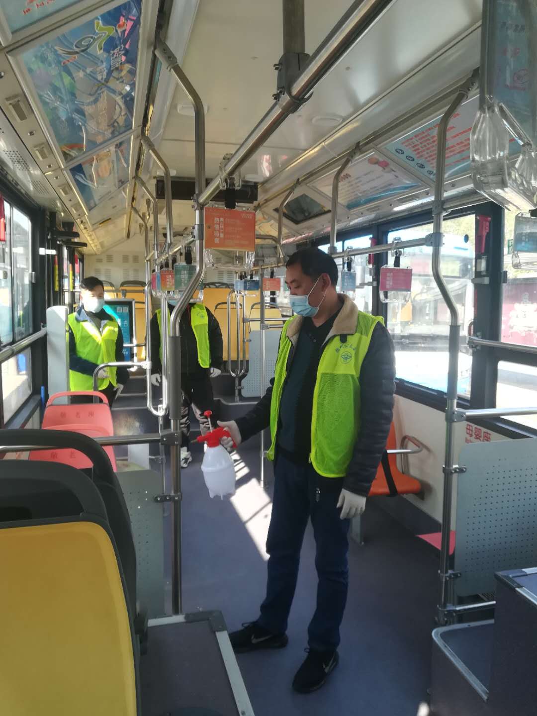岗前培训后,志愿者们分工明确,在公交站的志愿者们拎着手持喷壶对待恢复营运线路车辆的地面、扶手、座位进行消毒工作,确保做到不留死角;在车站的志愿者们,协助车站工作人员做好旅客引导工作,测量体温、以及扫码登记等。