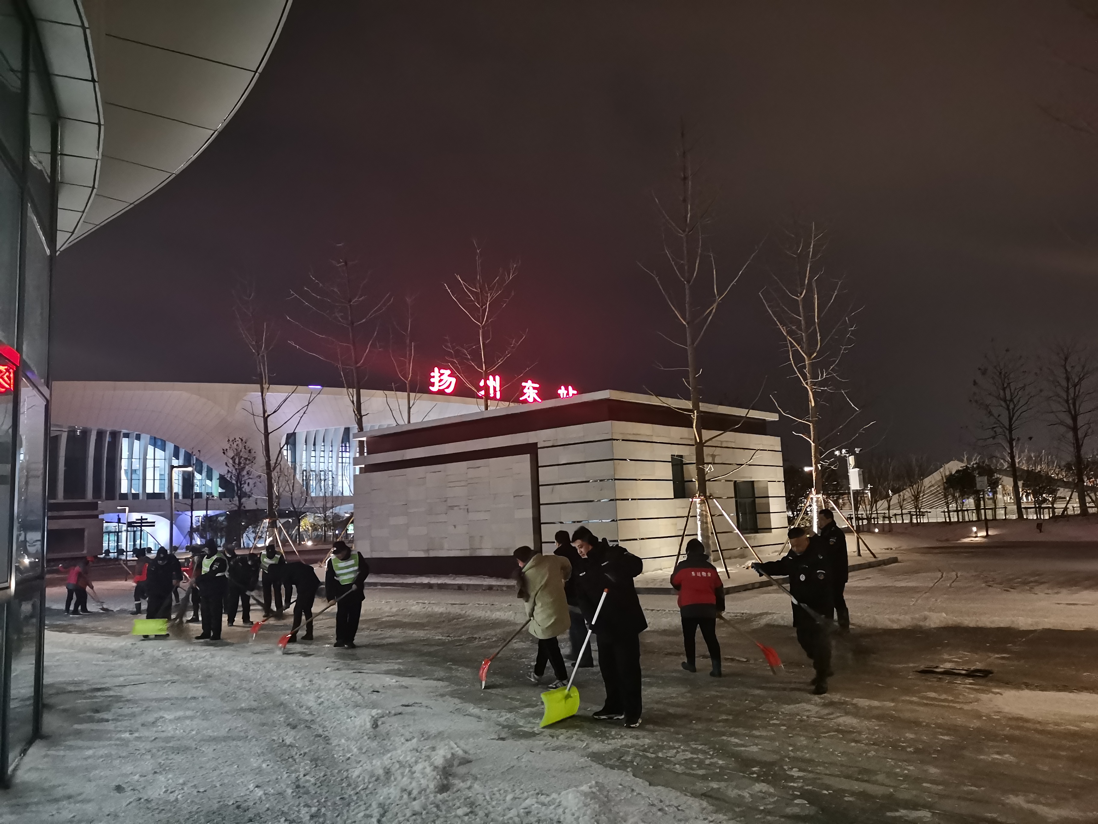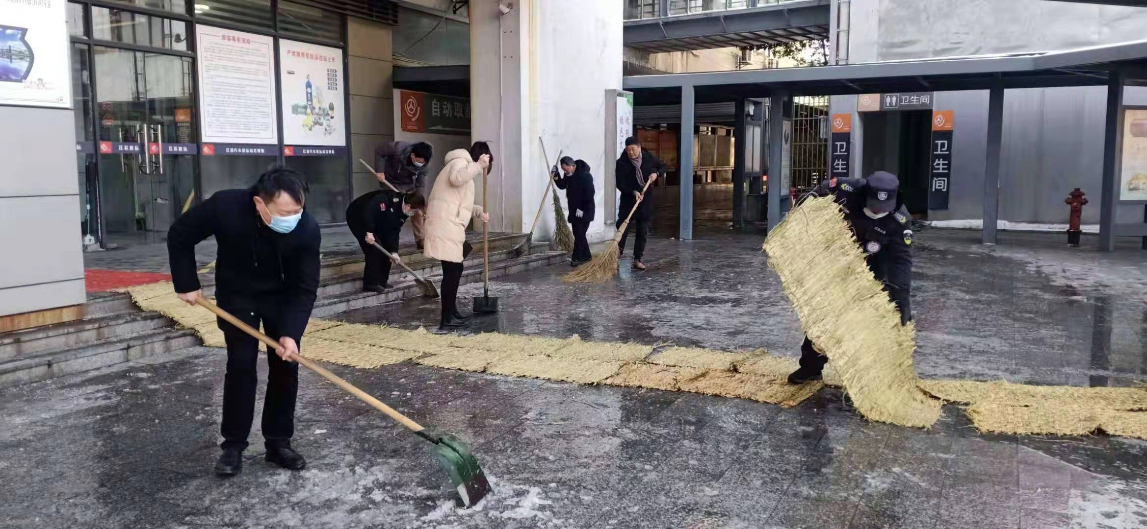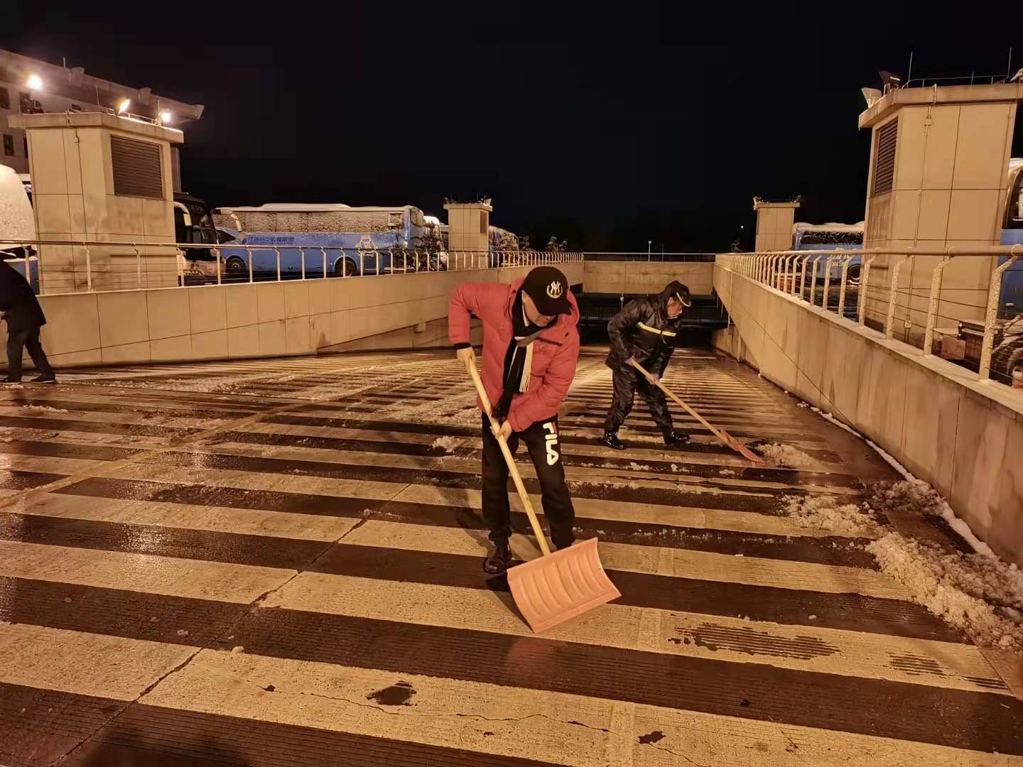 大雪过后,融雪除冰是旅客出行的保障,车站连夜安排职工、物业根据雪情实施作业,确保道路通畅。