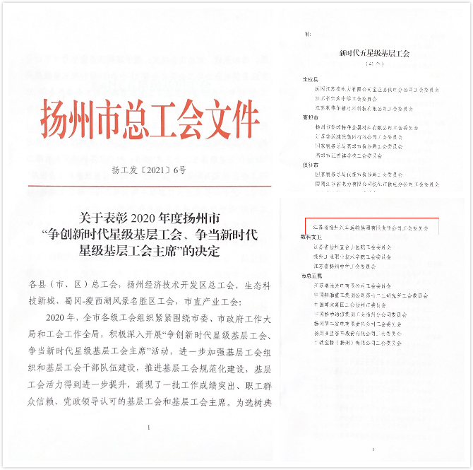 近日,市总工会下发《关于表彰2020年度扬州市“争创新时代星级基层工会、争当新时代星级基层工会主席”的决定》和市建设工会下发《关于表彰2020年度工会工作先进单位、先进个人的决定》,金沙娱场城app7979工会荣获扬州市“新时代五星级基层工会”和建设工会“优秀基层工会”称号,工会主席获评扬州市“新时代五星级基层工会主席”,工会干部获评建设工会“优秀工会干部”。