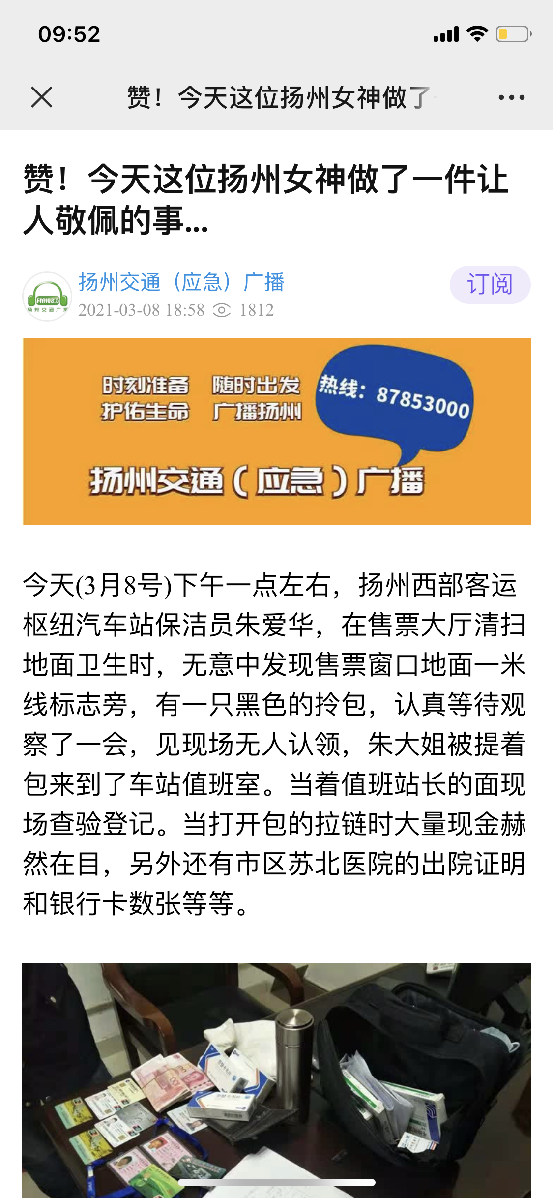 扬州站保洁员工拾金不昧,平凡举动获赞扬