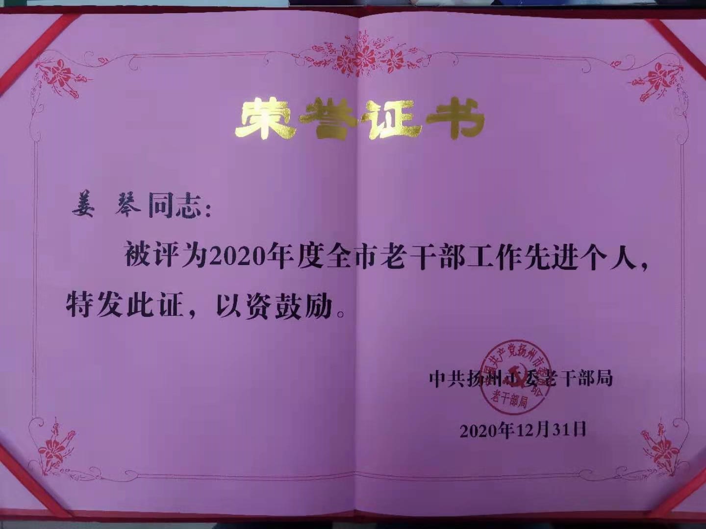 姜琴同志获“2020年度全市老干部工作先进个人”称号