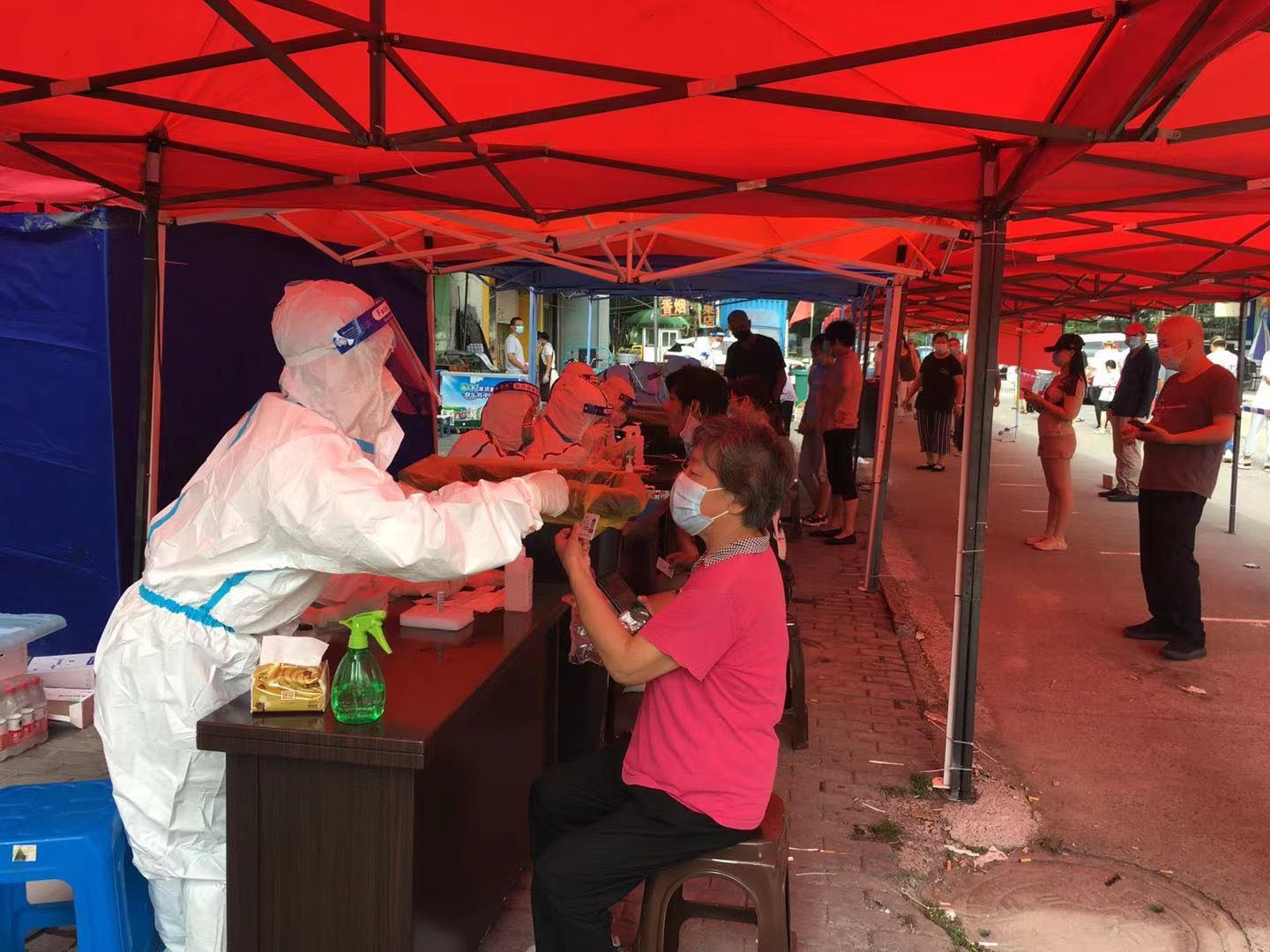 随着时间的推延,户外炎热难耐,不是亲身经历,真难以想象冲在第一线的医护人员是怎么熬过来的。为时近几个小时的这段艰难时光中,我好几次觉得自己快缺氧窒息了,不过看着其他志愿者送来的降温冰块,给我们全身喷洒酒精降温,谁又何尝不是负重前行呢?在一次次鼓励加油中,终于完成了上午的核酸检测任务,当我脱下防护服后,衣服可以挤出水来,双手被汗渍泡的发白。同时,排队做核酸的居民也很辛苦,个个汗流浃背,他们听从指挥,秩序井然,有的向我们问候,“你们也辛苦了!”,心里很是感动。