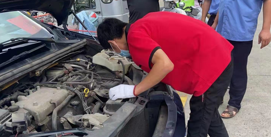 8月14日中午13.00,接到厂部电话通知,因疫情来扬州支援的南京公务车辆因水温过高而无法行驶停在⻄区大润发停车场 ,得知情况后许学仁又主动请缨前去抢修,他立即与车主取得了联系并向车主询问车辆故障现象,随后和同伴冯琪准备好工具便出发。赶到现场后,他们对⻋辆进行了检修,从而发现水箱爆裂导致水温升高,随即联系配件供应商,但因疫情和道路管控原因配件无法送达,许学仁自己开车去寻找配件,一同前往的机修工冯琪便开始对水箱进行拆解,两边同时进行着,展开了一场与时间赛跑的“抢修战役”,当回到救援地点,水箱以拆解好等待安装,他俩便开始安装,装配完毕后开始试车与检查水温,水温正常且风扇完美转动,车辆得已运行,他两露出了开心的笑容。