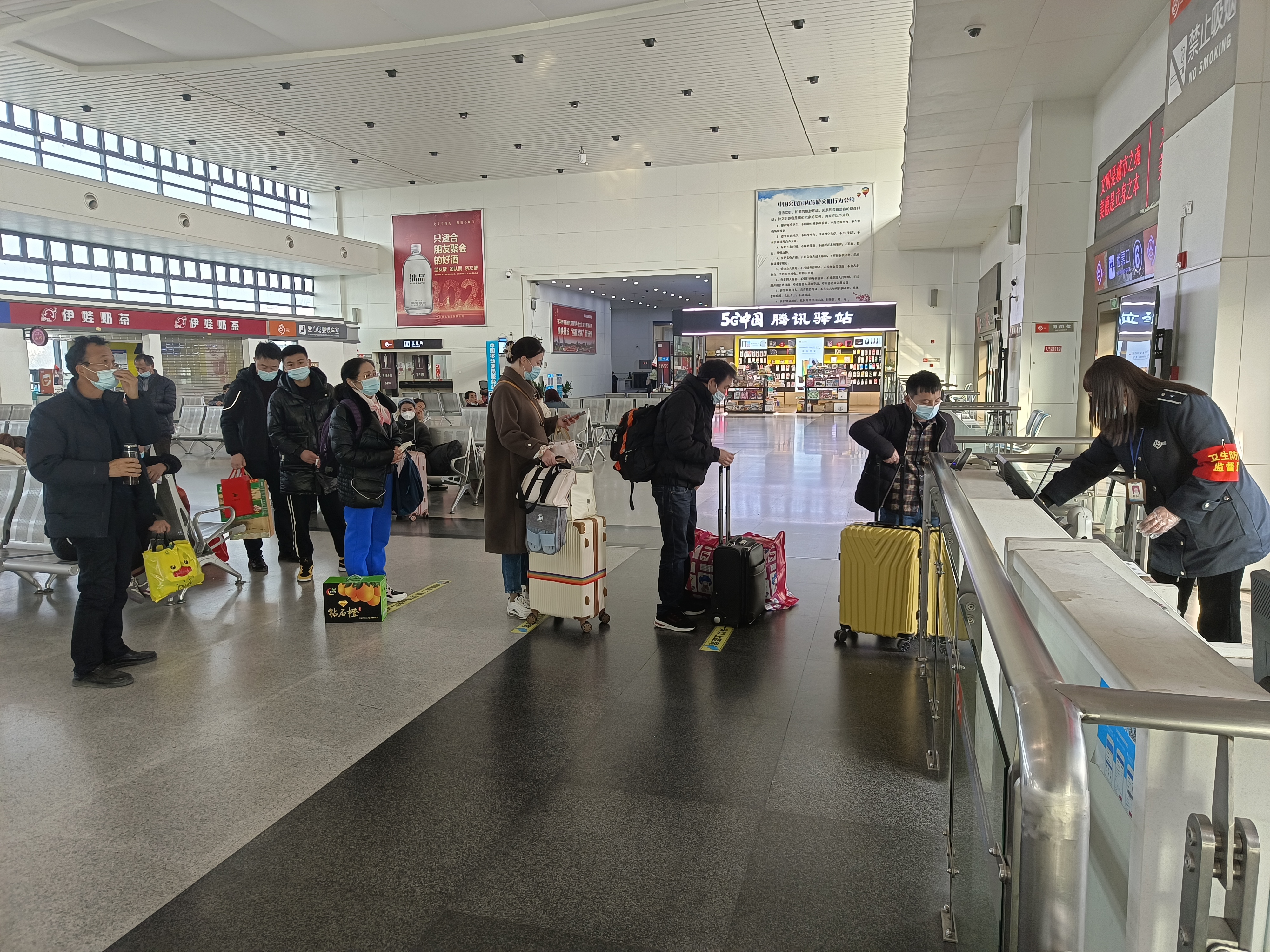 客流量虽然不多,但客运站在疫情防控方面并没有放松警惕,时刻绷紧疫情防控这根弦,进出站口严格按照疫情防控各项举措,工作人员引导旅客有序分散进站候车,主动出示健康码、行程码,进行扫码测温,同时提醒佩戴好口罩,做好个人防护,全力保障广大旅客平安顺利出行。
