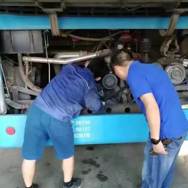 热浪滚滚的场地上,已经被汗水湿透了衣服的赵志明师傅,脚蹬保险杠,趴在热烘烘的引擎上检修,一边还叮嘱一旁等候的校车驾驶员相关注意事项。