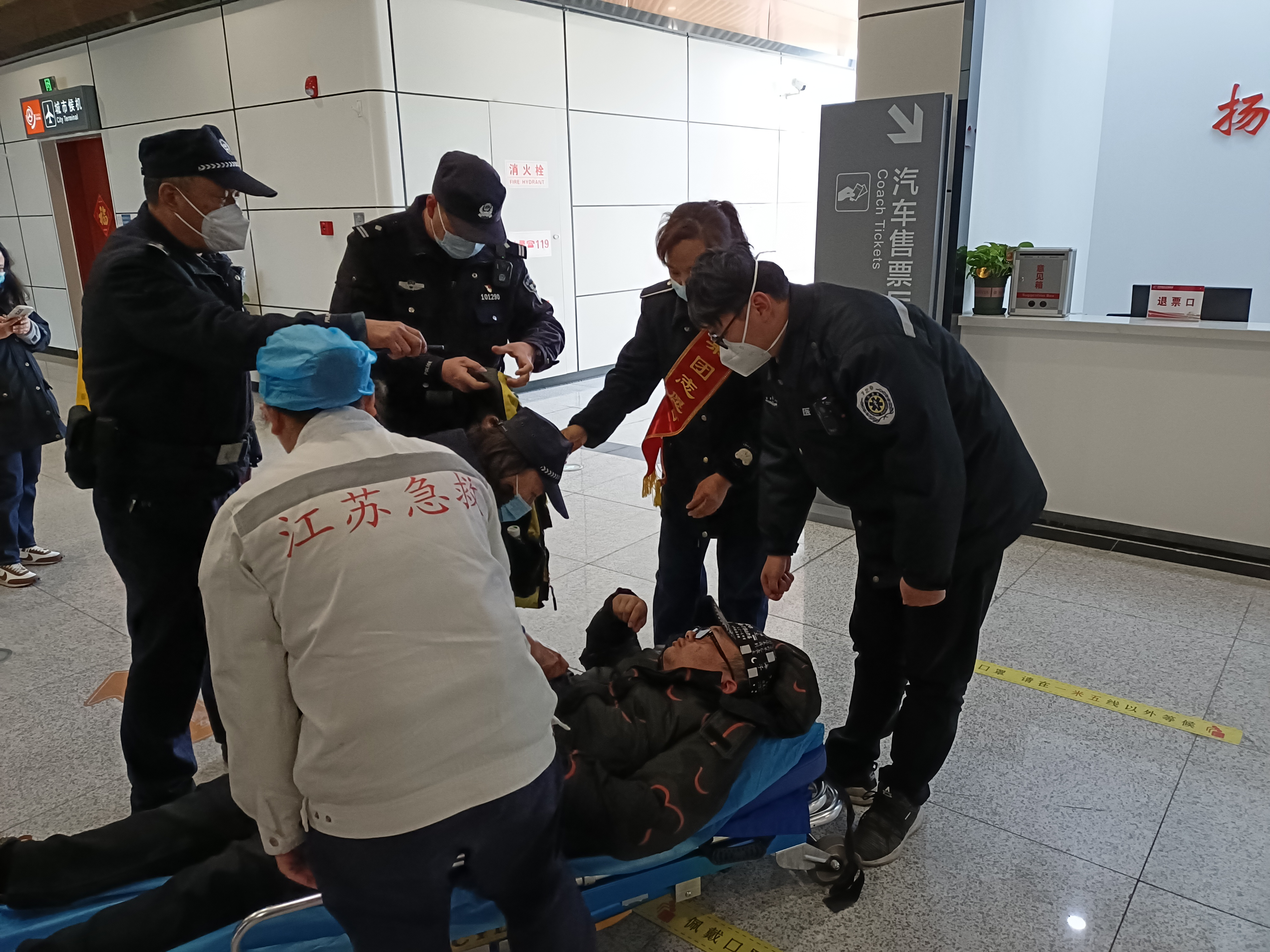 2月16日下午,扬州东枢纽汽车站售票处,一名正在购票的旅客突发癫痫,晕倒在地,现场工作人员及志愿者立即进行了救助。