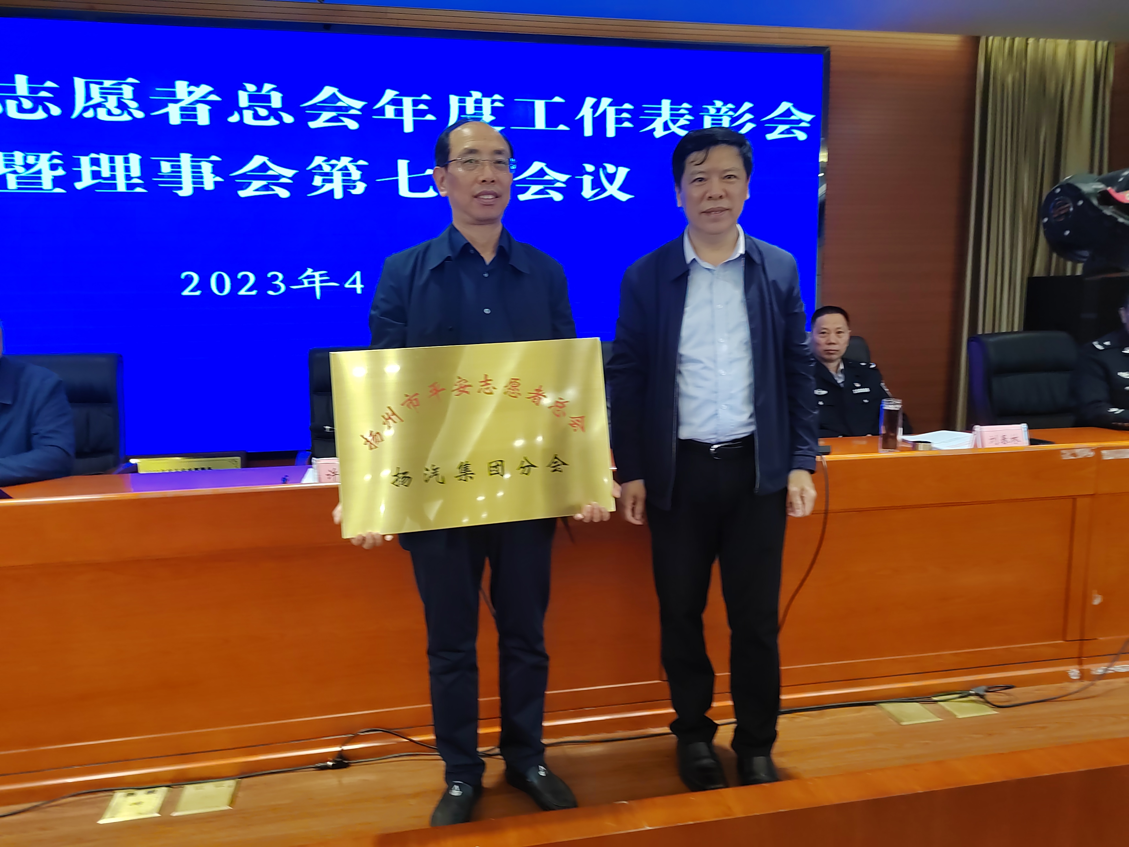 4月28日,扬州市平安志愿者总会召开理事会第七次(扩大)会议,市委政法委常务副书记许林灿出席会议。金沙娱场城app7979被授予分会单位,集团党委副书记、纪委书记、工会主席陈家宏被任命为扬州市平安志愿者总会金沙娱场城app7979分会会长,工会副主席、党群工作部经理孙进被任命为扬州市平安志愿者总会金沙娱场城app7979分会秘书长。